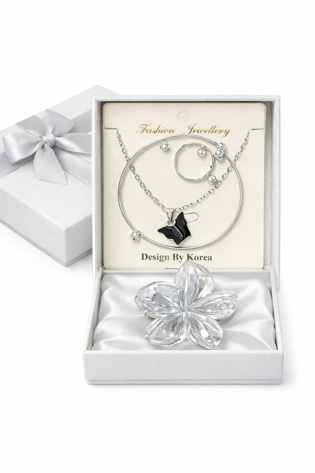 silver jewellery set gift, necklace earrings bracelet set, charm bracelet gift set, premium ladies jewellery, silver necklace gift set, women jewellery combo, gifting jewellery set for women, stylish silver jewellery set.